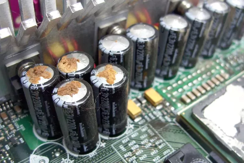 2- Bulging: when the electrolyte liquid is heated and wants to evaporate and leak, it pushes the capacitor’s aluminum shell which causes it to bulge just before its valve breaks and lets the liquid out.